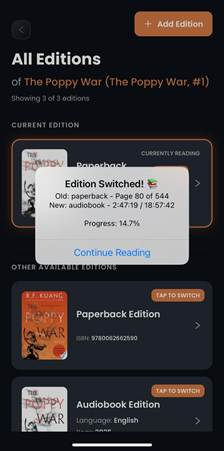 The Change Edition feature lets you switch the format of the same book while keeping your reading progress intelligently synced.