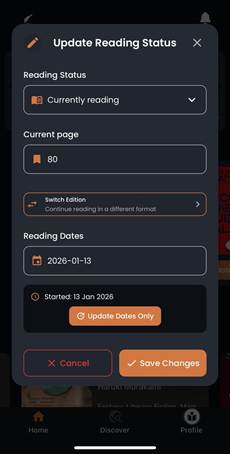 Different formats measure progress differently. Pages for physical books, percentage for e-books and minutes for audiobooks. Biblophile normalizes all of them into a single progress percentage, ensuring accuracy no matter how you read.