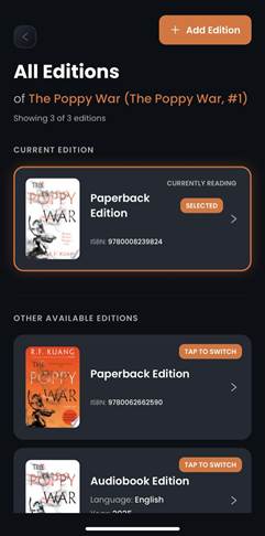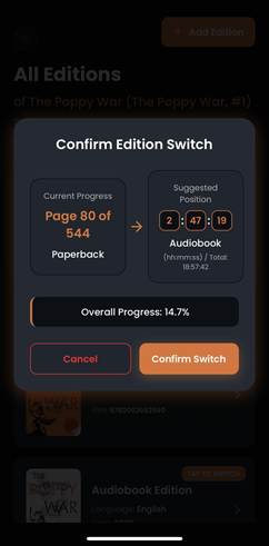 Readers often try to estimate, “Which chapter was I on?”, “How far into the audiobook should I start?” With the Change Edition feature, Biblophile does the math for you – instantly and precisely.